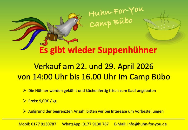 Wolfgang Mottl Ähnliche BeiträgeSuppenhühner im Camp Bübo30. Dezember 2024Wir wünschen euch ein frohes neues Jahr 202530. Dezember 2024In eigener Sache zum Camp Bübo17. Dezember 2023 Vorheriger BeitragÖffnungszeiten